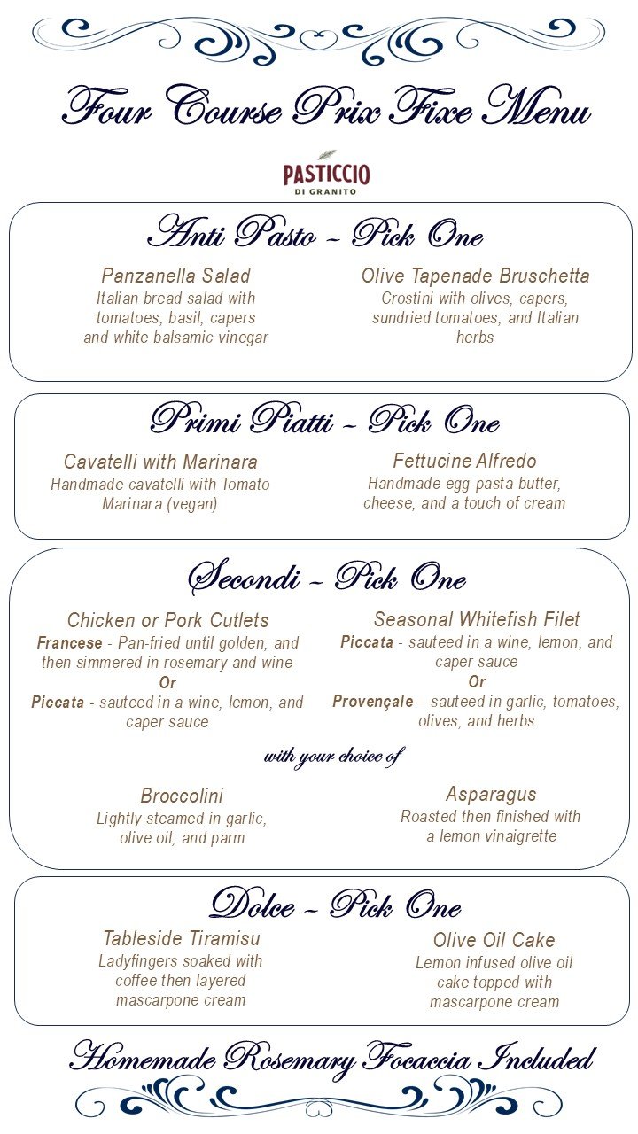 Enjoy my thoughtfully curated four-course prix fixe dinner for $95 per person, featuring selections for antipasto, primi piatti pasta, secondi entrée with seasonal vegetable, and dessert—crafted to simplify decisions and deliver exceptional value for intimate gatherings of 2–8 guests. The entire party enjoys an elegantly plated dinner using the same selected menu (substitutions may adjust the price), so contact me and let’s plan a beautiful evening at your table.